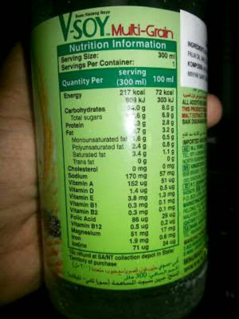 V Soy Multigrain Review. 1 botol 200 ml per porsi. Finde Kalorienanzahl Kohlenhydratgehalt und weitere Nährwertinformationen für V-soy - Vsoy Multigrain Milk und mehr als 2 Mio.